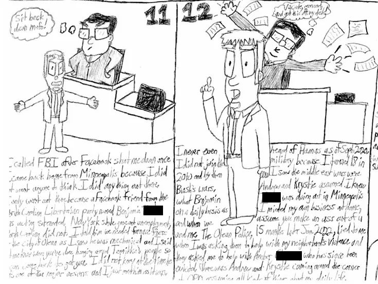 11. I called FBI after Facebook shut me down once I came home from Minneapolis because I did not want anyone to think I did anything out there. I only went out there because a Facebook friend from the North Carolina Libertarian Party named Benjamin [last name]* was acting stranded. New York State gave out unemployment, North Carolina did not. I told him we needed furnace fixers in the city of Olean as I saw he was mechanical and I said let me know when you’re done hanging around [illegible]’s people so I can come back to get you. I did not know at the time he is one of the major arsons and I just met him as it was.