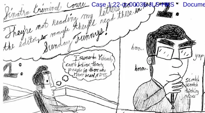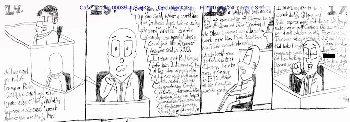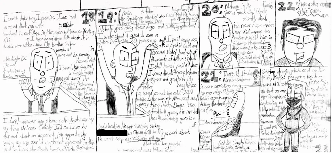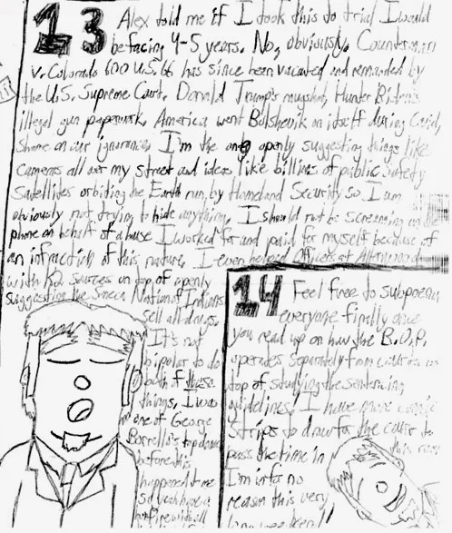 14. Feel free to subpoena everyone finally once you read up on how the B.O.P. operates separately from courts on top of studying the sentencing guidelines! I have more comic strips to draw for the court to pass the time in this room I’m in for no reason this very [illegible].”
