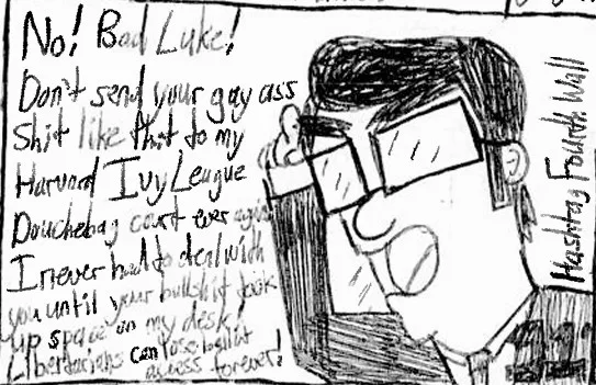 Don’t send your gay ass shit like that to my Harvard Ivy League Douchebag court ever again! I never had to deal with you until your bullshit took up space on my desk! Libertarians can lose ballot access forever!”