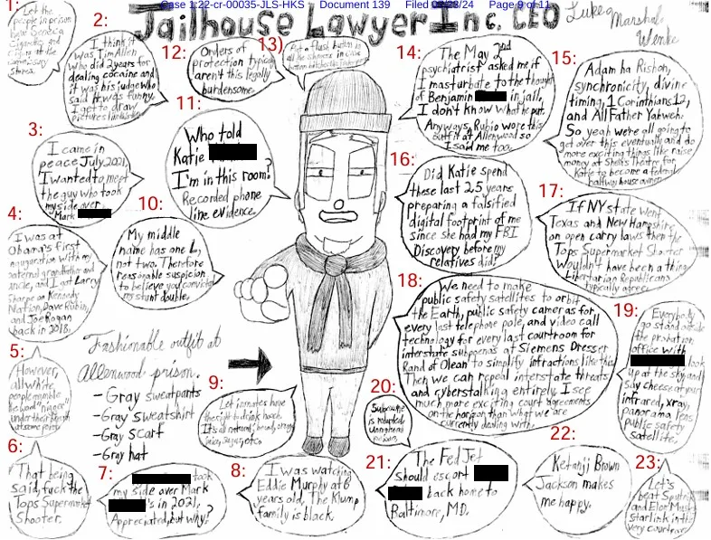 Luke Wenke mailed a letter containing these drawings to the federal judge overseeing his probation violation case in July of 2024. In the images featured in the previous installment of this blog, he appears to be pitching an idea for a musical to the judge. More specifically, Luke Wenke suggests putting on a show at Shea’s in Buffalo in order to raise money for the opening of a new federal halfway house.