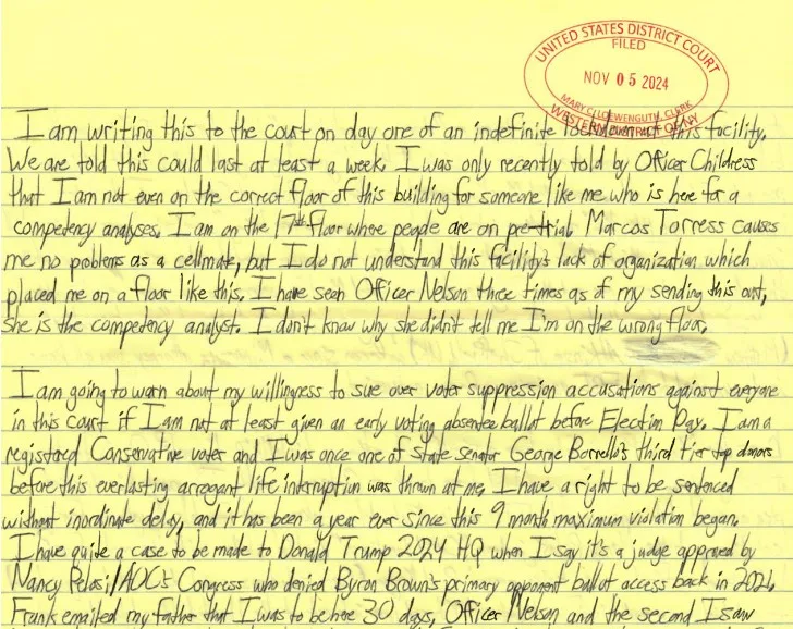 “I am writing this to the court on day one of an indefinite lockdown at this facility. We are told this could last at least a week. I was only recently told by Officer Childress that I am not even on the correct floor of this building for someone like me who is here for a competency analysis. I am on the 17th floor where people are on pre-trial. Marcos Torress causes me no problems as a cellmate, but I do not understand this facility’s lack of organization which placed me on a floor like this. I have seen Officer Nelson three times as of my sending this out. She is the competency analyst. I don’t know why she didn’t tell me I’m on the wrong floor.