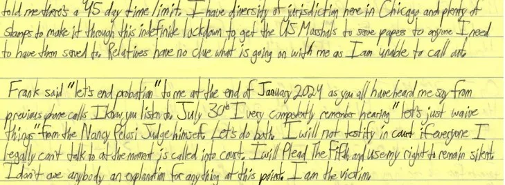 Frank said ‘let’s end probation’ to me at the end of January 2024 as you all have heard me say from previous phone calls I know you listen to. July 30th I very competently remember hearing ‘let’s just waive things’ from the Nancy Pelosi judge himself. Let’s do both. I will not testify in court if everyone I legally can’t talk to at the moment is called into court. I will Plead The Fifth and use my right to remain silent. I don’t owe anybody an explanation for anything at this point. I am the victim.”