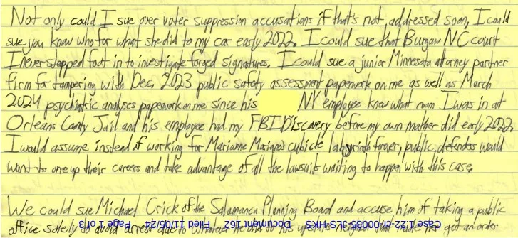 “Not only could I sue over voter suppression accusations if that’s not addressed soon, I could sue you know who for what she did to my car early 2022. I could sue that Burgaw NC court I never stepped foot in to investigate forged signatures. I could sue a junior Minnesota attorney partner firm for tampering with Dec. 2023 public safety assessment paperwork on me as well as March 2024 psychiatric analyses paperwork since his [city] NY employee know what room I was in at Orleans County Jail and his employee had my FBI Discovery before my own mother did early 2022. I would assume instead of working for Marianne Mariano cubicle labyrinth forever, public defenders would want to one up their careers and take advantage of all the lawsuits waiting to happen with this case.