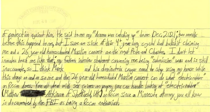 “…of protection against him. He said to me my ‘drama was catching up’ to me Dec. 2021; two months before this happened to me, but I sure am sick of this 4+ year long crystal ball bullshit claiming me and a 26 year old homeschooled Muslim convert are the next Pete and Chasten. I don’t let inmates touch me like that; my father’s interview statement concerning me being ‘submissive’ was and is still inaccurate, so I think Mark [last name] and his dominatrix cougar need to stop using my house while this drags on and on so me and the 26 year old homeschooled Muslim convert can do what ‘electricrubber’ on Recon does. You all deal with sex crimes on paper, you can handle looking at ‘electricrubber’ (Matthew Atkinson of Sheffield, UK) on Recon since a Minnesota attorney you all know is documented by the FBI as being a Recon enthusiast.”