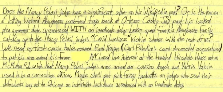 “Does the Nancy Pelosi judge have a significant other on his Wikipedia yet? Or is the karma of letting Waleed Abughanem push food trays back at Orleans County Jail past his locked plea agreement date unsentenced WITH an inordinate delay broken apart from his Abughanem family catching up to the Nancy Pelosi judge’s ‘Covid loneliness’ victim status with the rest of us? We need my first cousin twice removed P— [last name] (Carl Paladino’s court documented acquaintance) to put his arm around his former [city] NY based love interest at the Haunted Hinsdale House out on McMahon Rd. with that Nancy Pelosi judge’s arms around our cousins Angela and Valerie. Valerie used to be a corrections officer. Maybe she’ll put pink fuzzy handcuffs on judges who send their defendants way out to Chicago on indefinite lockdowns unsentenced with an inordinate delay.”