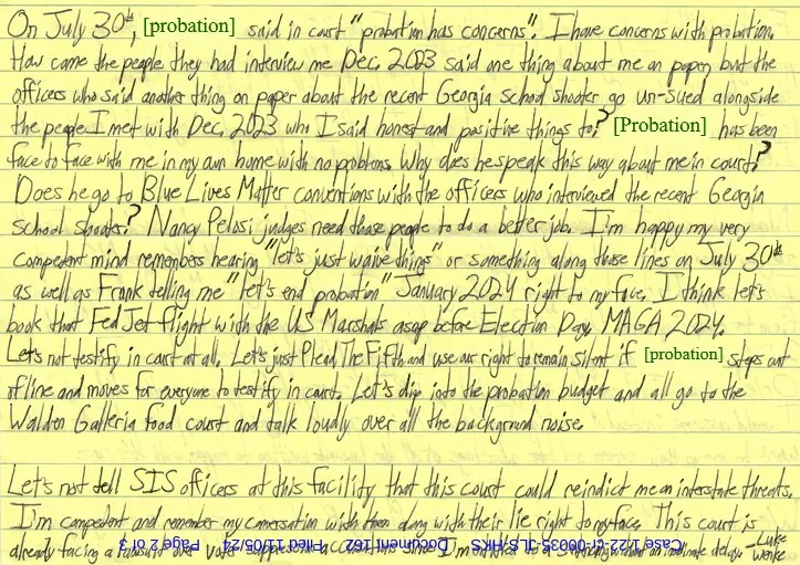 “On July 30th, [probation officer] said in court ‘probation has concerns’. I have concerns with probation. How come the people they had interview me Dec. 2023 said one thing about me on paper, but the officers who said another thing on paper about the recent Georgia school shooter go un-sued alongside the people I met with Dec. 2023 who I said honest and positive things to? [Probation officer] has been face to face with me in my own home with no problems. Why does he speak this way about me in court? Does he go to Blue Lives Matter conventions with the officers who interviewed the recent Georgia school shooter? Nancy Pelosi judges need those people to do a better job. I’m happy my very competent mind remembers hearing ‘let’s just waive things’ or something along those lines on July 30th as well as Frank telling me ‘let’s end probation’ January 2024 right to my face. I think let’s book that FedJet flight with the US Marshals asap before Election Day. MAGA 2024. Let’s not testify in court at all. Let’s just Plead The Fifth and use our right to remain silent if [probation officer] steps out of line and moves for everyone to testify in court. Let’s dip into the probation budget and all go to the Walden Galleria food court and talk loudly over all the background noise.