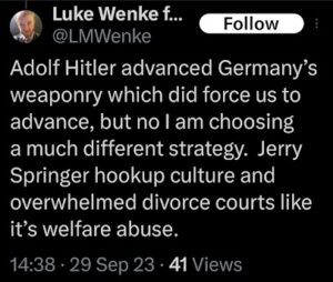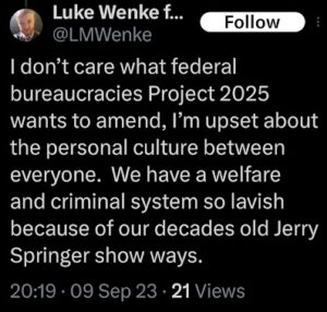 “There is much more to Luke Wenke than using his eyeballs to look at government officials and form politically oriented opinions on them. Somebody needs to know that especially after seeing no significant other on his Wikipedia April 2023 when I got home; don’t say I didn’t warn you about Katie [last name]’s financially devastating man seduction tactics.”