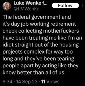 I was going to include examples demonstrating Wenke’s hypocrisy (namely his tendency to cry poor while poverty shaming, accusing others of a having a bad work ethic despite his own long periods of unemployment/refusal to work jobs that he thinks are beneath him, etc.), but I think it would make more sense to include these in a separate post (coming at a later date). As always, this gallery is a work in progress, because when it comes to Luke Wenke’s words, there’s always more where that came from.