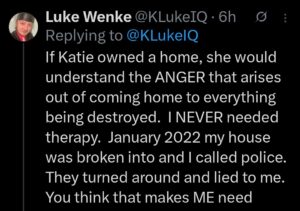 Categories: Luke Wenke, [Alleged] False Allegations: burglary/home invasion, conspiracy/collusion, trespassing, vandalism/property damage, welfare abuse/fraud; Obsessions: Katie Obsession; Threats: threats to sue