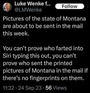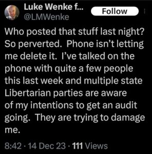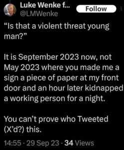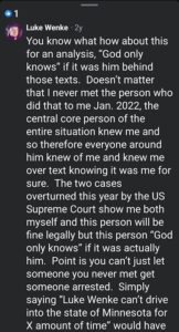 Of course, Wenke probably won’t ever admit to being the person behind those text messages, just like he denied sending harassing letters to his victims after blatantly admitting to it on social media (see the 2023 collection below). Here are some examples reflecting this pattern of Wenke thinking he’s slick, at times even taunting his targets in an “I know you know, but you technically can’t prove it was me” sort of way. To add insult to injury, he also accuses me and others of impersonating him and doing other things that he’s actually doing.