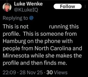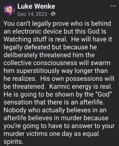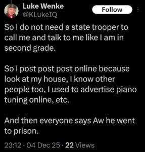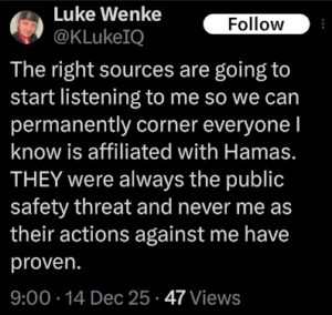 NOTE: In the weeks leading up to his most recent arrest on 12/17/2025, Luke Wenke used “Hamas” as a code word for several of his victims including myself, Ryan (his romantic obsession), and the Minnesota attorney he served prison time for cyberstalking.