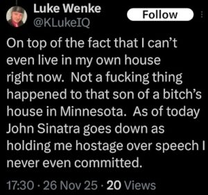 NOTE: In the weeks leading up to his most recent arrest on 12/17/2025, Luke Wenke used “Hamas” as a code word for several of his victims including myself, Ryan (his romantic obsession), and the Minnesota attorney he served prison time for cyberstalking.