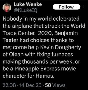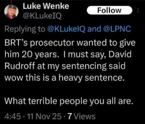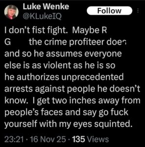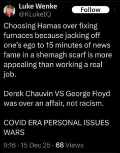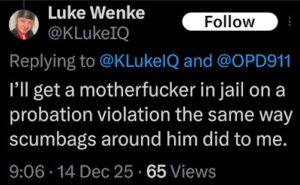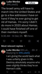 NOTE: In the weeks leading up to his most recent arrest on 12/17/2025, Luke Wenke used “Hamas” as a code word for several of his victims including myself, Ryan (his romantic obsession), and the Minnesota attorney he served prison time for cyberstalking. I believe that Wenke’s use of the term “Israeli Army” is a reference to a theoretical paid assassin (i.e. a hitman).