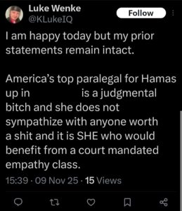 I’m also not a habitual criminal like Wenke claims, and I have not committed any crimes against Luke Wenke. All I’ve wanted, for years now (and like most of Wenke’s other victims), is to be left alone. But he refuses to leave me alone and his behavior against me has only escalated over time, regardless of my response (or lack thereof) to it. In fact, that’s why this website exists. Luke Wenke has made it clear that he’s not going to stop stalking me and trying to ruin my life, so I might as well share my perspective with the world. After all, I’m entitled to the same freedom of speech that he is, and unlike Wenke, I support my narrative with actual evidence, rather than foaming irrationally at the mouth like a rabid animal and expecting people to believe me.