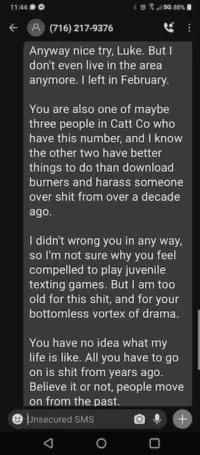 Luke Wenke found other ways to harass me through technology. Within days of his release from the Chautauqua County Jail on August 10th of that year, I received a text message from Wenke’s mother reminding me that she knows my address (which is public information, but I perceived the message as an attempt to scare or upset me and a thinly veiled threat to doxx me, which Wenke was threatening to do in his social media posts).