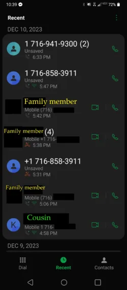 The “number labelled “Family member” is all the same person. As you can see, my phone had no activity for about 25 minutes after I placed a call to said family member. Out of the blue, at 5:31, I started receiving calls from both the emergency dispatch line and the family member. This call log matches up with my phone records. Bottom line, I did not dial 911 that day.