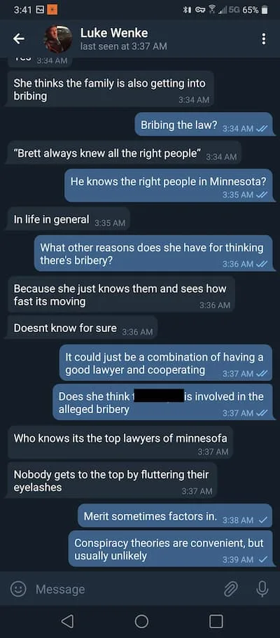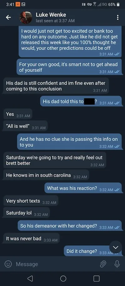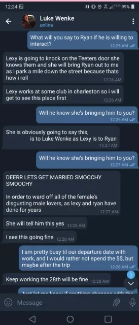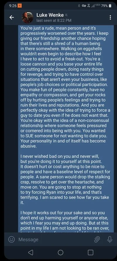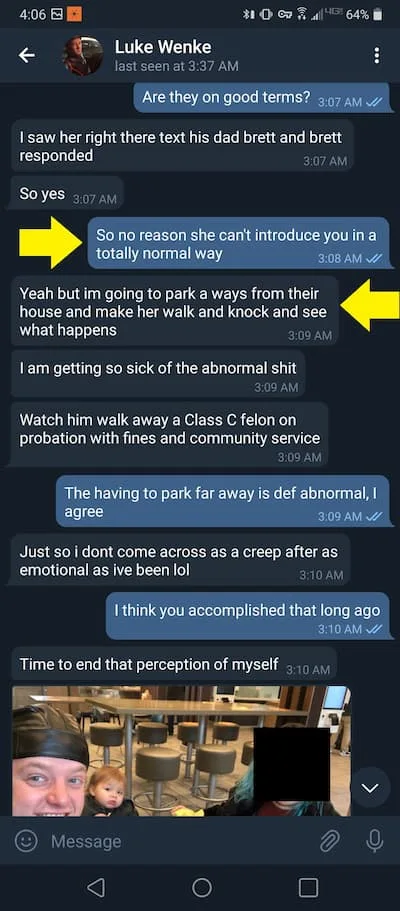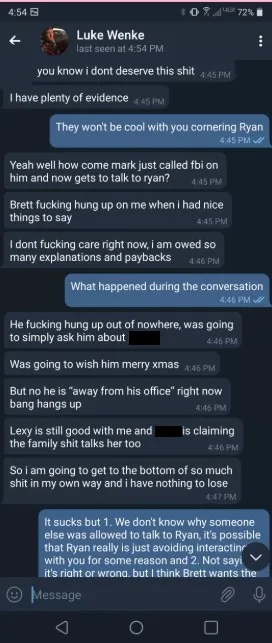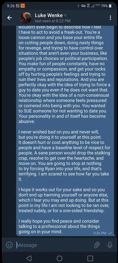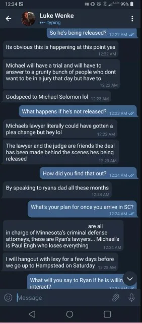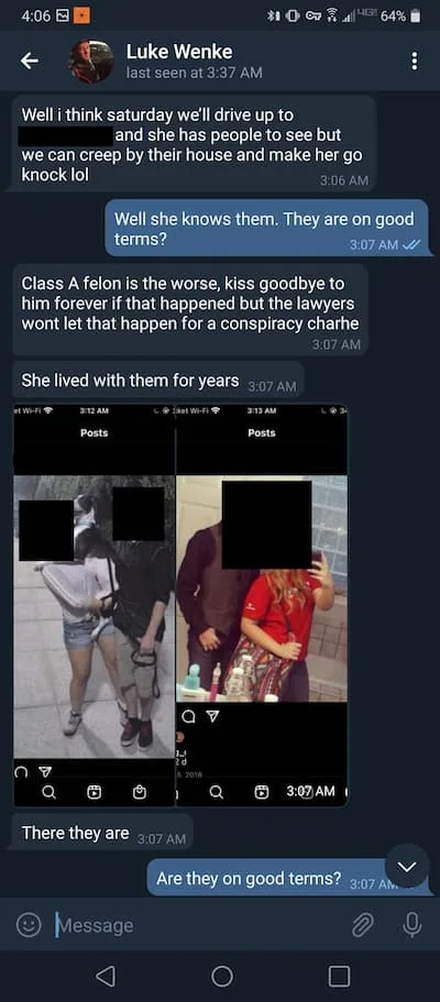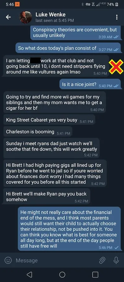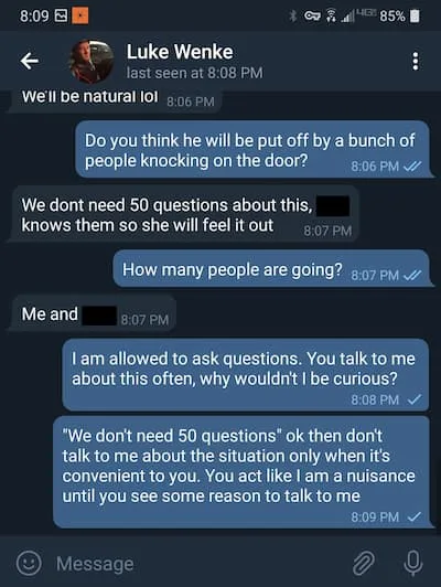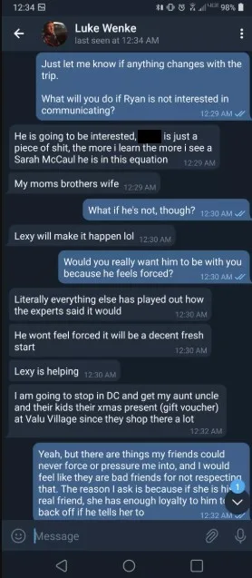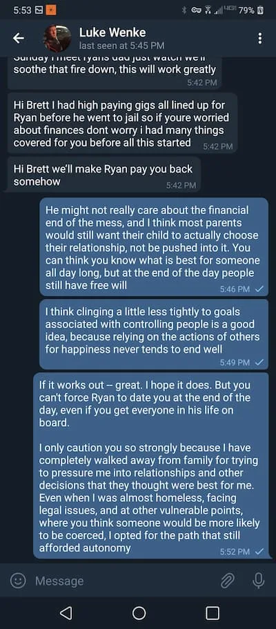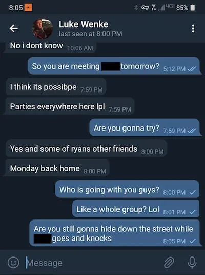 This instantly concerned me, because it was plainly evident that Ryan’s family wanted to be left alone. As you’ll see at some point throughout these Telegram conversations, Luke Wenke told me that he planned to park down the road from the family’s house and send Ryan’s female friend to the door. To me, it sounded like he knew the family didn’t want to see him, and it seemed like a planned ambush. Normal people who are welcome at someone’s home simply go to the door and knock or ring the doorbell. They don’t hide out of sight while having someone go to the door in their stead.