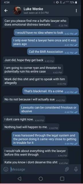 In the conversation below, Luke Wenke mentions wanting to sue his romantic obsession’s (Ryan’s) family for causing emotional distress by “keeping him and Ryan apart.”