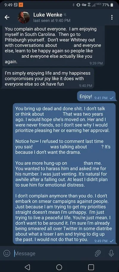 It’s not in my custom to divulge the contents of private conversations, even with people I’m no longer on good terms with. But as I’ve stated elsewhere on this website, Luke Wenke has gone to great lengths in his efforts to smear me as a degenerate lowlife who lacks any credibility whatsoever. While I’m not too worried about anyone important believing what Luke Wenke says about me, he’s made it clear that he’ll stop at nothing to try destroying my life, and I finally decided to put the truth out there after remaining silent about the situation for three-plus years in hopes that he’d finally stop.