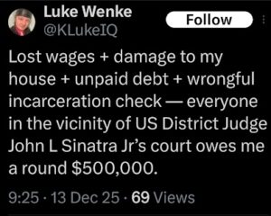 “The US Marshals may very well be sued and go the way of the recently fired 5000 NY state corrections officers if they are up in Buffalo being forced by John L. Sinatra Jr.’s court to forge paperwork lying about where Luke Wenke has been transferred these past 3 years.” (p. 2)