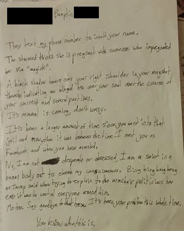 Written in 2020 and 2021, both of these letters are creepy but in very different ways. The first one is creepy in a standard perverted and seemingly obsessed sense, while the second letter is cryptic. It reminds me of the way some people express bizarre spiritual beliefs when they’re high, except it’s mixed with a romantic obsession, which makes it even creepier.