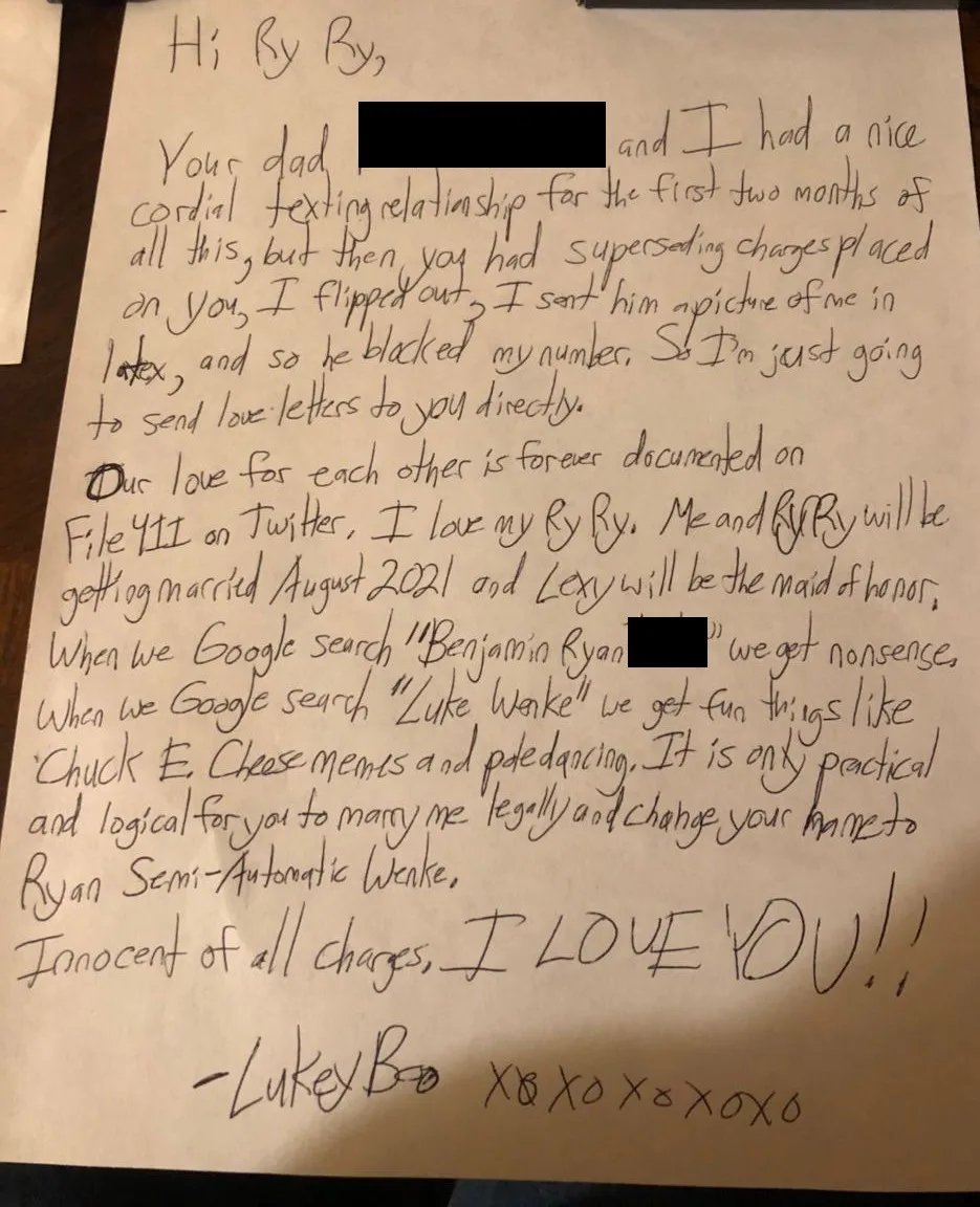 “Our love for each other is forever documented on File411 on Twitter. I love my RyRy. Me and RyRy will be getting married August 2021 and Lexy will be the maid of honor. When we Google search ‘Benjamin Ryan [redacted]’ we get nonsense. When we Google search ‘Luke Wenke’ we get fun things like Chuck E Cheese memes and pole dancing. It is only practical and logical for you to marry me legally and change your name to Ryan Semi-Automatic Wenke.