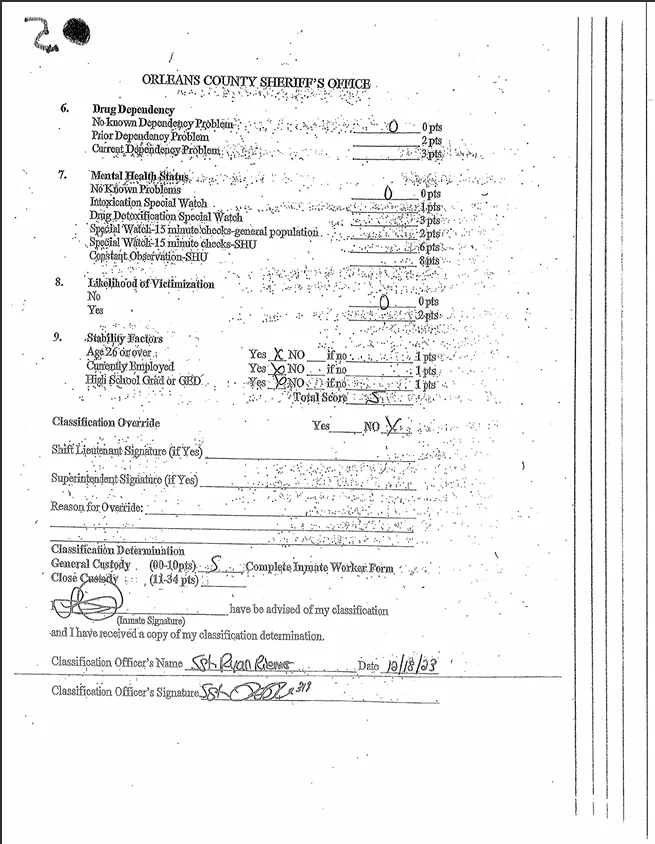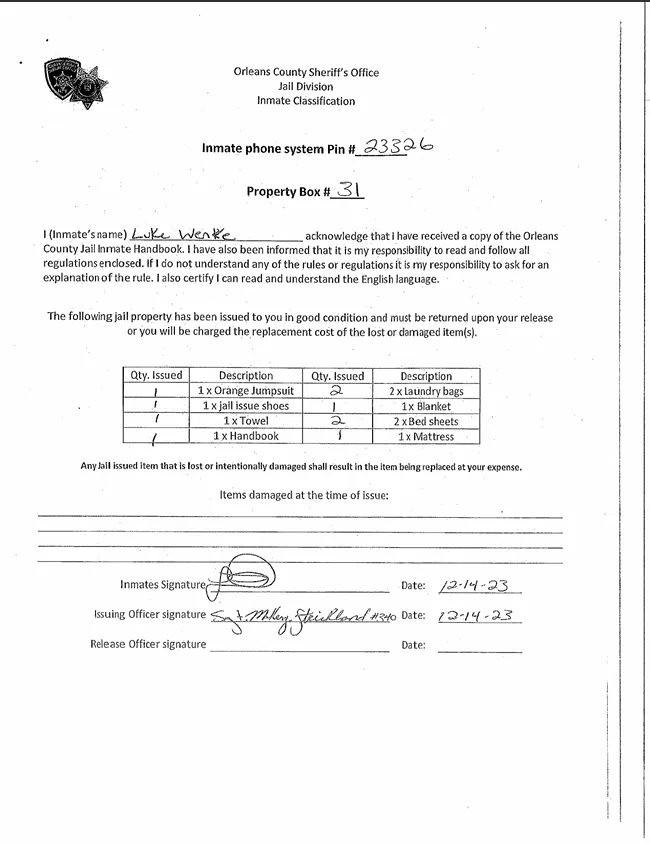 While I’m waiting until after Luke Wenke’s next court hearing (April 10th) to publicly post most of my recently obtained records, I’ve decided to share this booking paperwork. I obtained these documents from the Orleans County government through a Freedom of Information request along with correspondence records, which are currently available through this website’s private Facebook group.